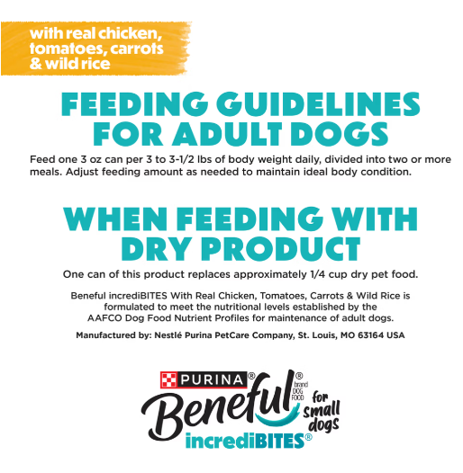 If you're looking for a small breed dog food that delivers big taste for small dogs, offer him Purina Beneful IncrediBites Small Breed Dog Food With Real Salmon, Tomatoes, Carrots, and Wild Rice in gravy dog food. These tender canned dog food recipes are made with real salmon and real vegetables you can see, including tomatoes, carrots and wild rice. Each serving of this real salmon dog food includes high protein for dogs to help support strong muscles while providing 23 essential vitamins and minerals for overall health. Featuring a tender texture that's easy for small dogs to chew, 100 complete and balanced nutrition for small breed adult dogs and no artificial colors, flavors or preservatives, Purina Beneful IncrediBites for small dogs is perfect for your little canine. Choosing joy means choosing recipes specially formulated just for your small dog; recipes that give him BIG taste for an expression of joy you can see.