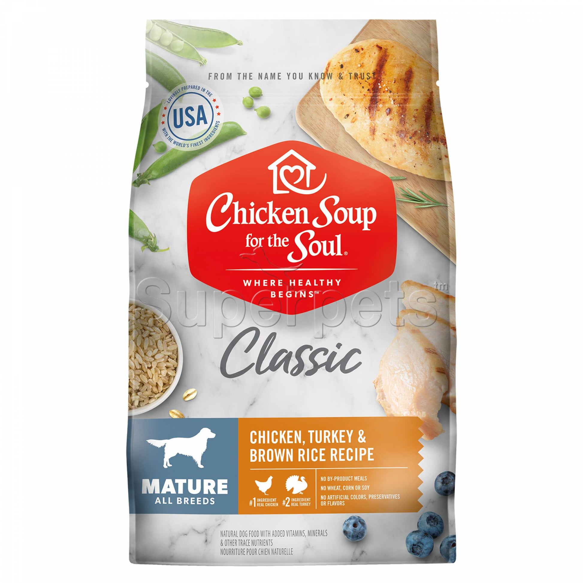 Chicken Soup for the Soul Classic Mature Chicken, Turkey & Brown Rice Recipe Dog Food is formulated to meet the nutritional levels established by the AAFCO Dog Food Nutrient Profiles for maintenance.