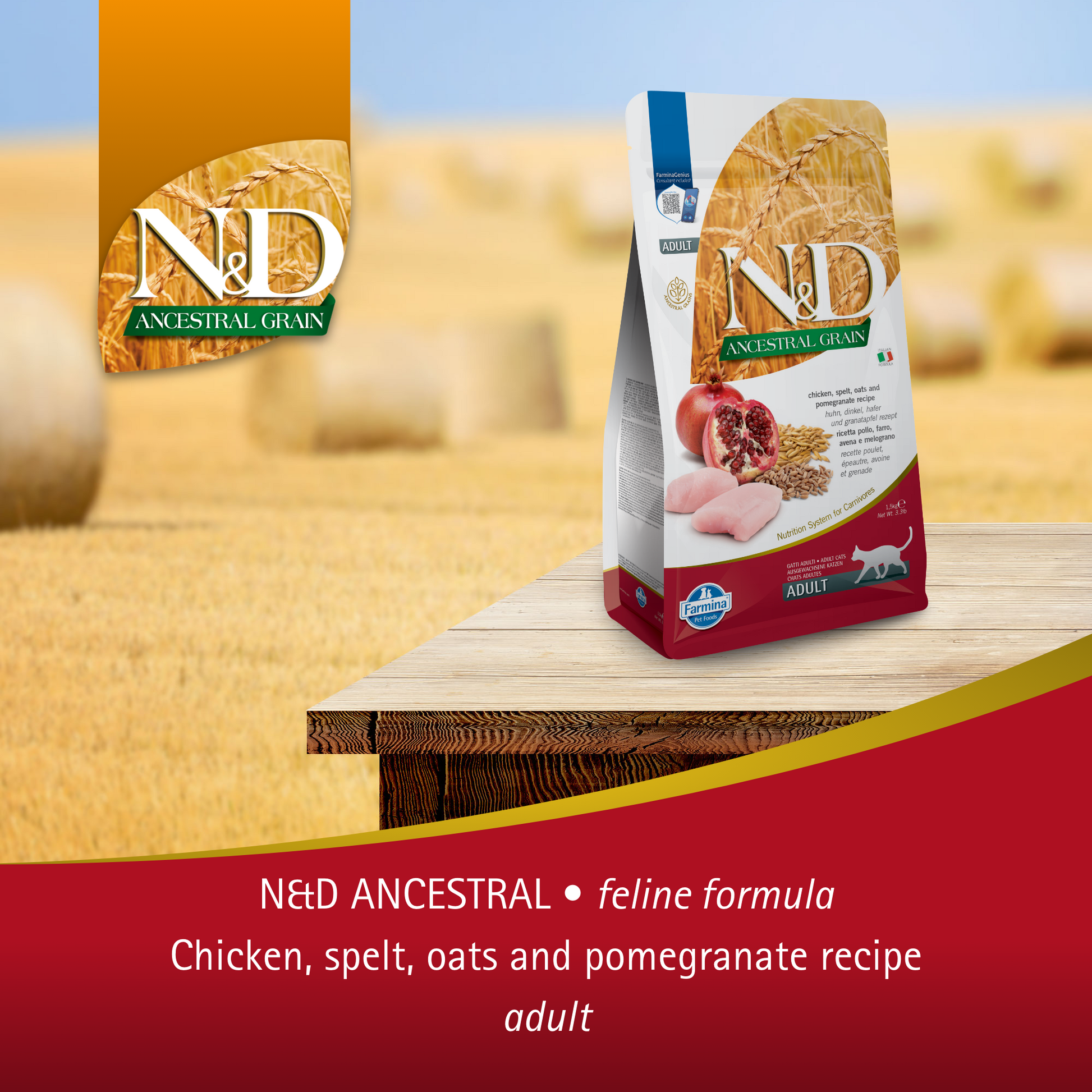 Complete Cat Food for All Life Stages. Farmina N&D Chicken & Ancestral Grain Recipe is formulated to meet the nutritional levels established by the AAFCO Cat Food Nutrient Profiles for all life stages.