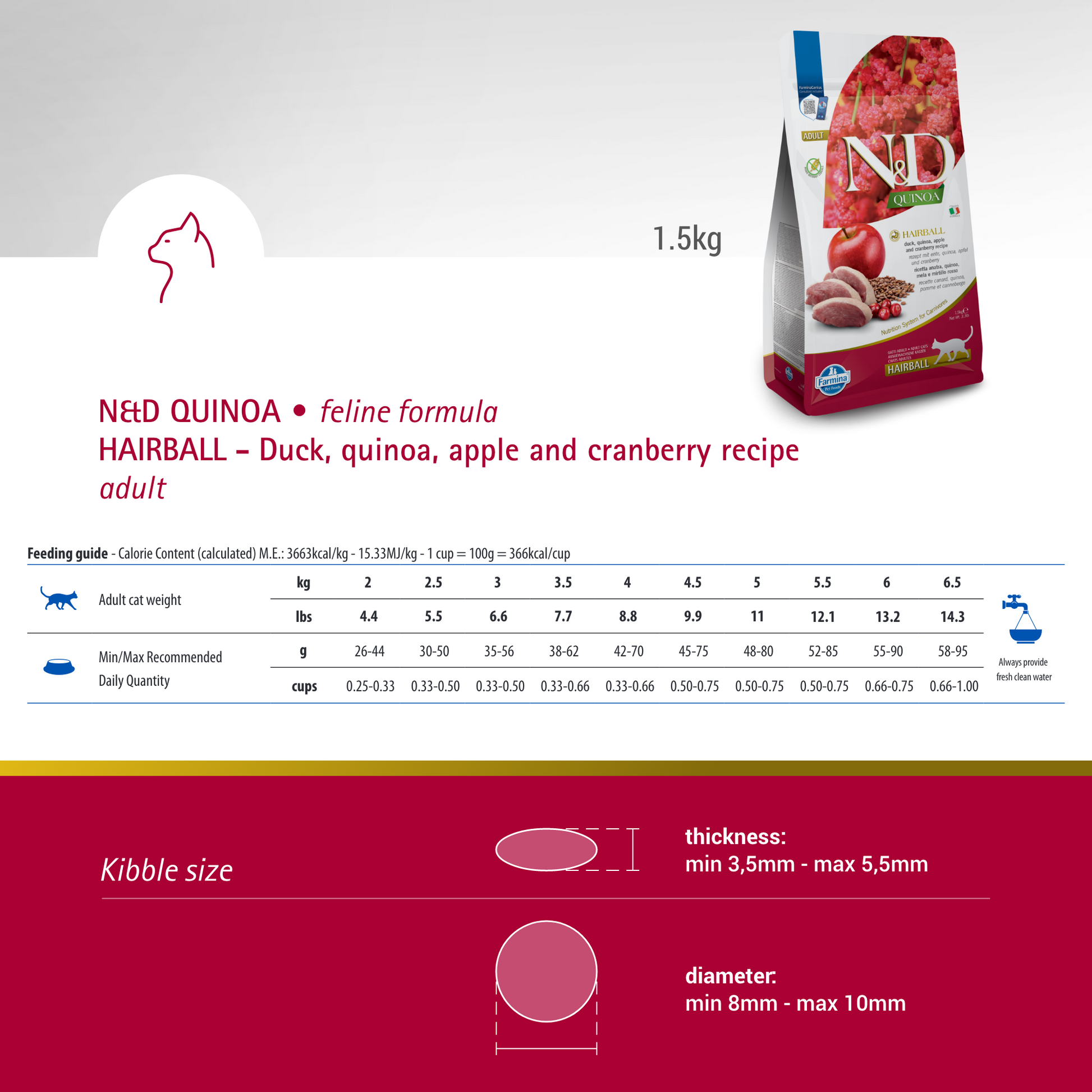 Say goodbye to pesky hairballs with Farmina N&D Quinoa Feline Duck Hairball Control Dry Cat Food. This specially formulated diet is scientifically designed to prevent hairball formation in your furbaby. With a unique blend of high-fiber ingredients, this recipe promotes the natural progression of hair through the digestive tract. Made with GMO-free duck sourced from local regions, this food is crafted in small batches using a twin-screw extruder at lower temperatures to retain essential nutrients. Plus, heat-sensitive vitamins and minerals are cold-pressed post-cooking for maximum bioavailability. And with premium natural preservatives, you can trust that this food will stay fresh.