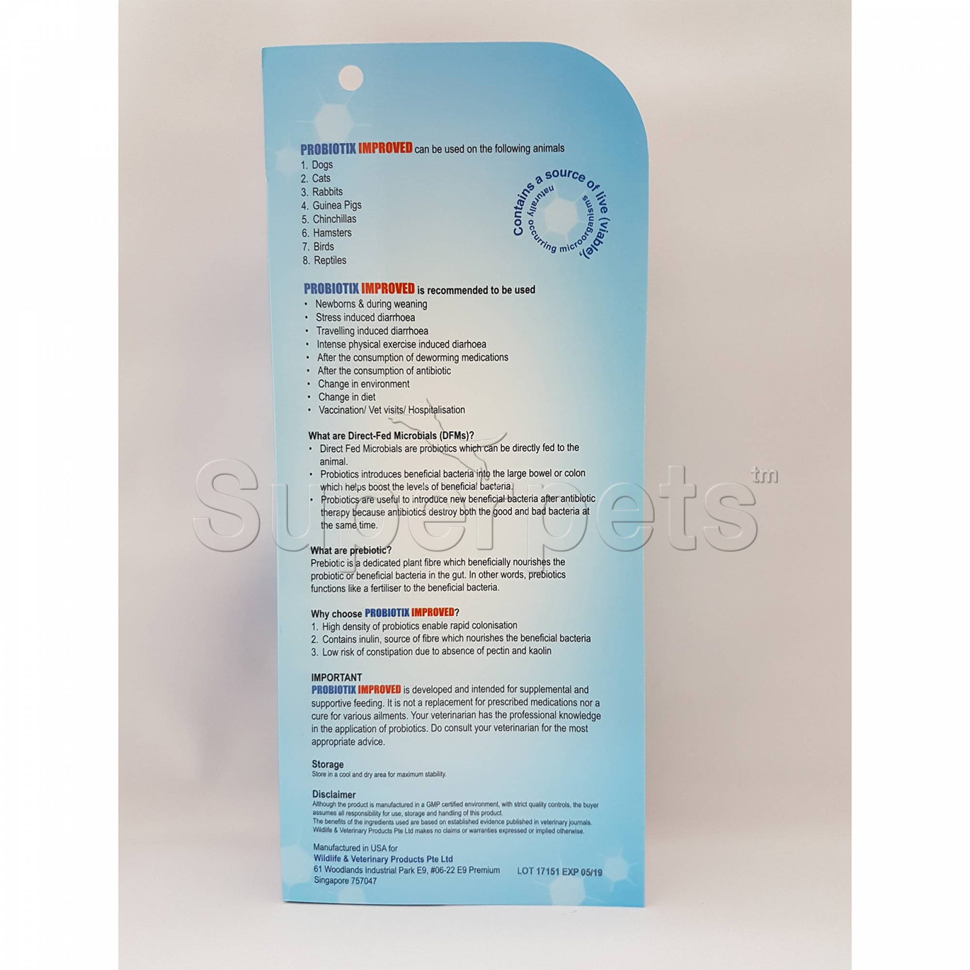 With 1 billion colony forming units (CFU) per syringe of naturally occurring micro organisms, Probiotix improved rapidly colonises the gut with beneficial bacteria with 4 different beneficial flora that are commonly found in dog, cats and rabbits and other species of animals.