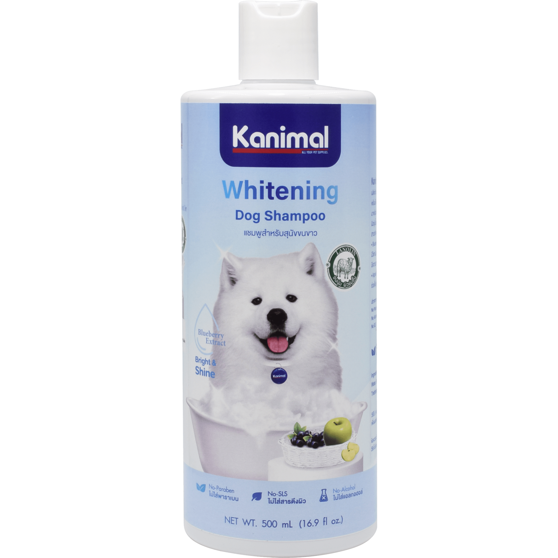 Kanimal Whitening Shampoo is a product for white-haired pets. The formula is gentle, clean, and safe, and provides a natural fresh scent. It is suitable for pets with sensitive skin and allergies. It comes with natural extracts such as blueberry, apple, and green tea extracts, providing a pleasant scent, moisturizing the skin, and making the fur soft and touchable. It also helps to turn the fur white again without leaving any chemical residue. It is free from ingredients that irritate the skin. It does not contain parabens, alcohol, or surfactants (SLS). – Paraben Free, Alcohol Free, SLS free