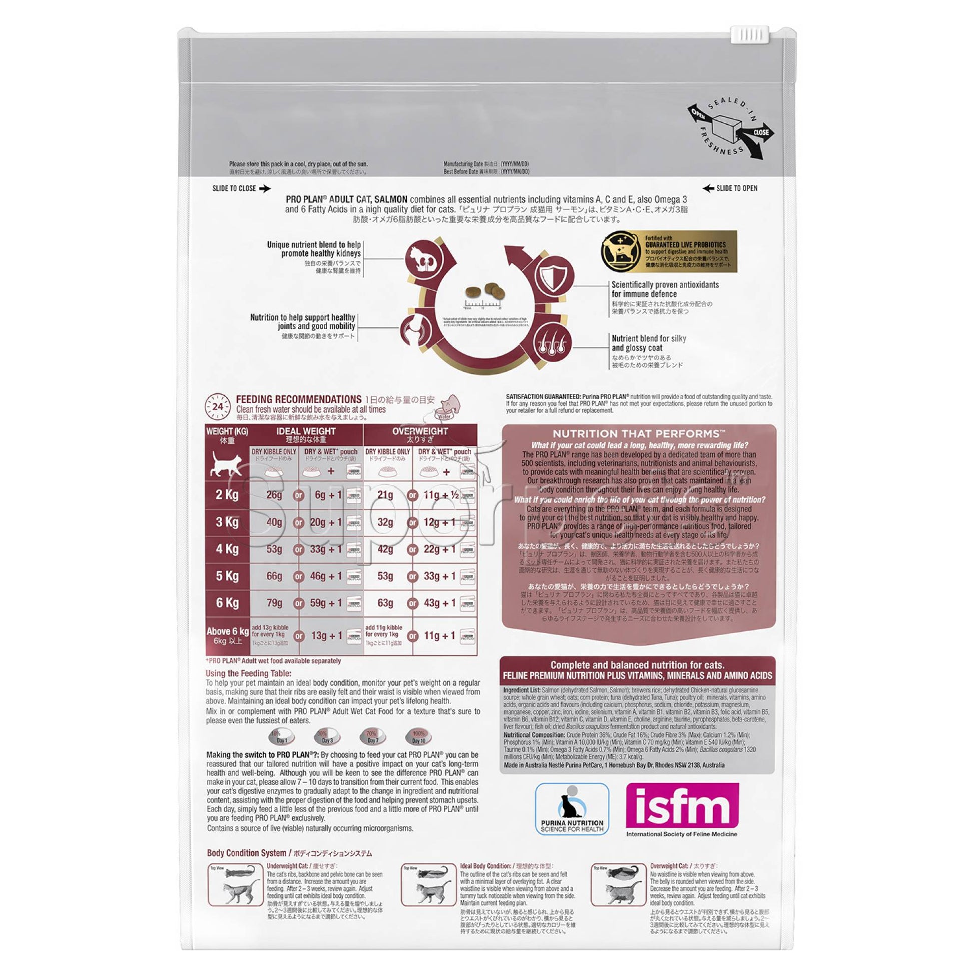 PRO PLAN® ADULT CAT, SALMON combines all essential nutrients including vitamins A, C and E, also Omega 3 and 6 Fatty Acids in a high quality diet for cats.