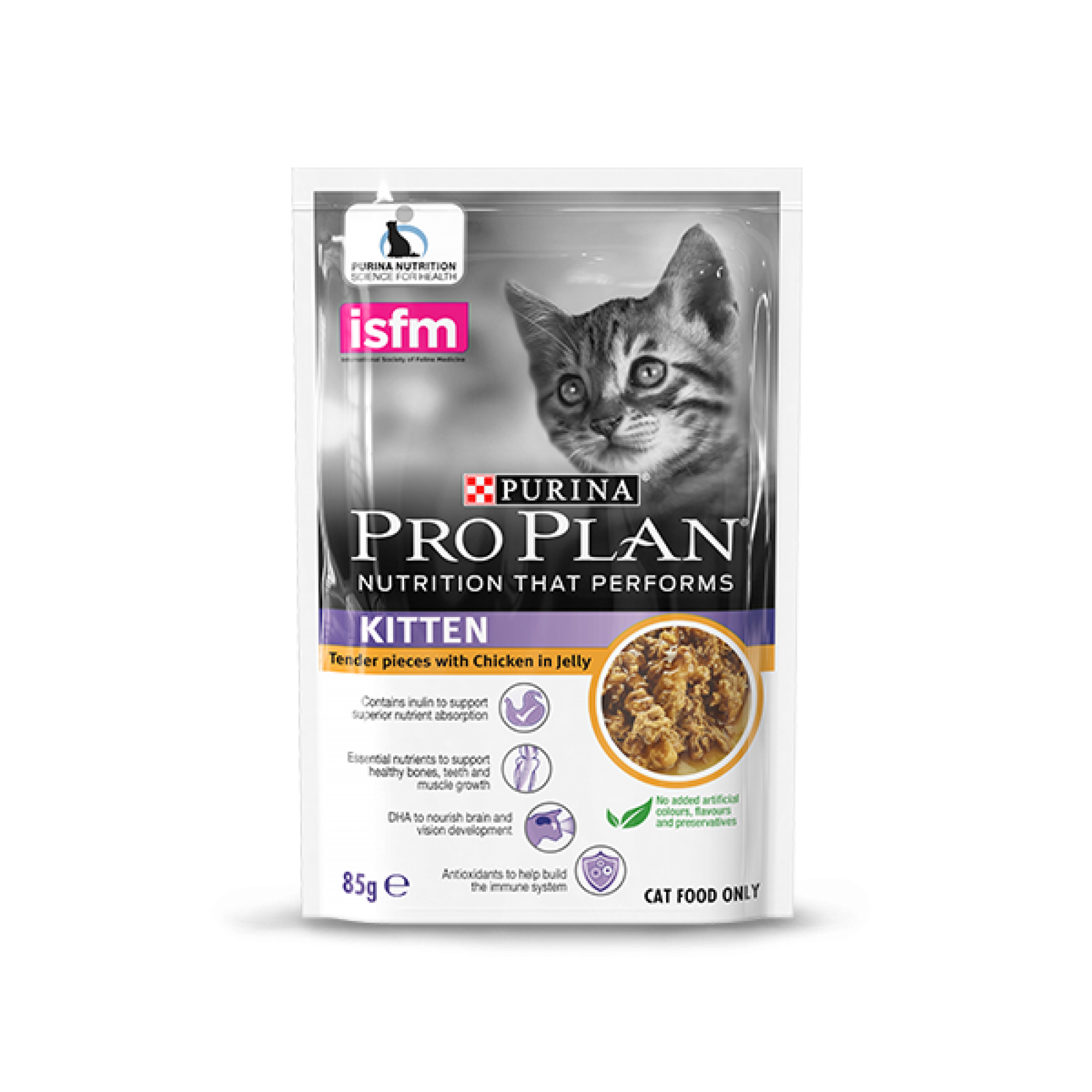 PRO PLAN Kitten Chicken in Jelly Wet Cat Food delivers complete and balanced nutrition and is formulated to meet the nutritional levels established by AAFCO for growth and reproduction.