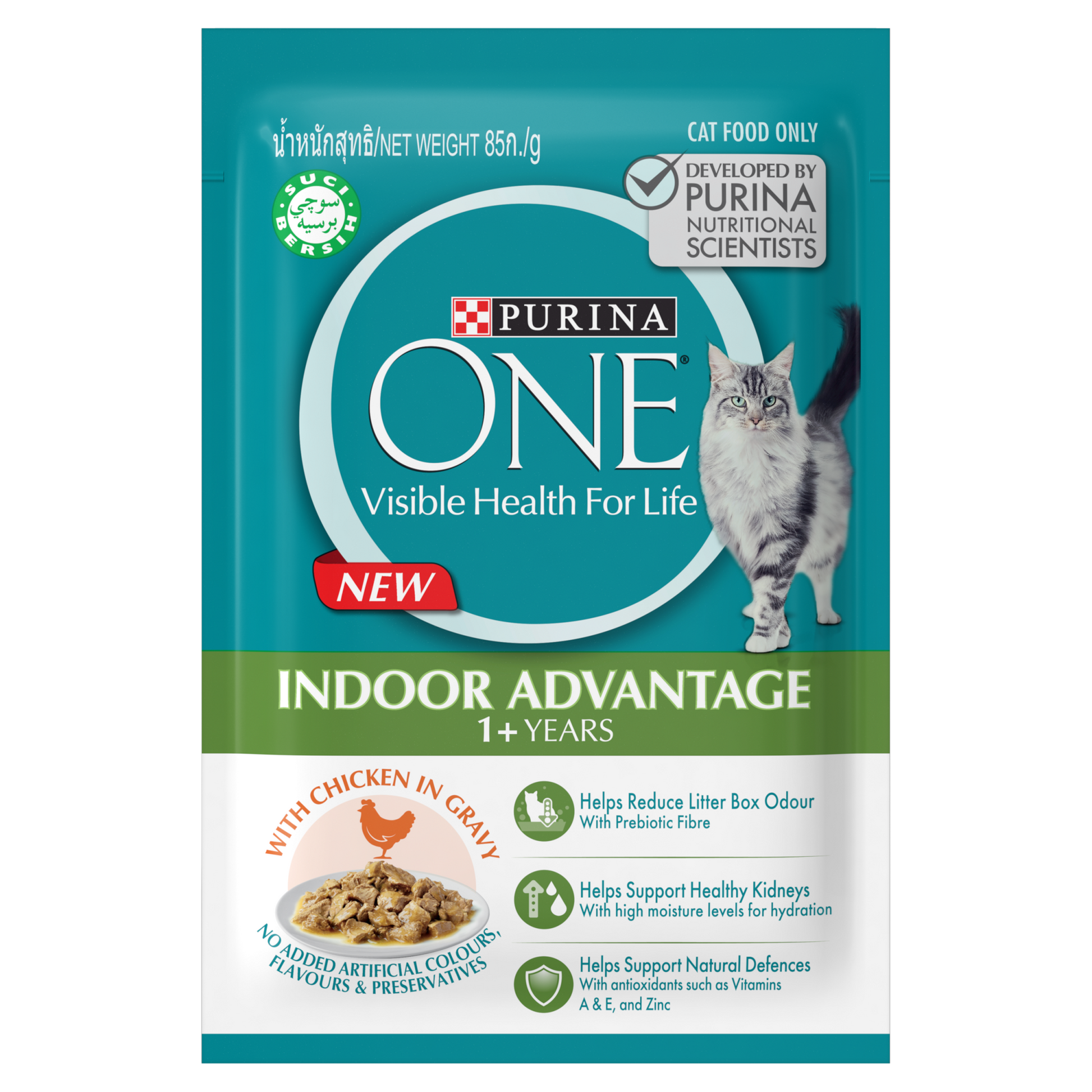 Purina One Indoor Advantage 1+ with Chicken in gravy deivers complete and balanced nutrition and is formulated to meet the nutritional levels established by AAFCO (Association of American Feed Control Officials) for growth.