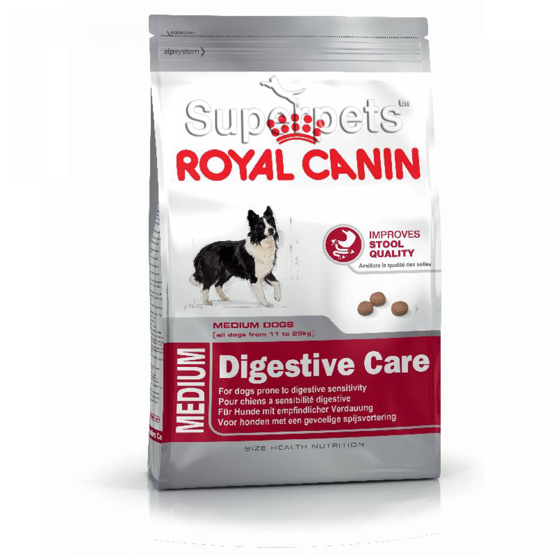 Royal Canin Adult Dog - Medium Digestive Care (11-25kg) 3kg Medium-sized dogs are famous for their energy, and were historically working dogs. Whether your medium dog is an indoor companion or spends time hunting outdoors, Royal Canin Medium formulas help these dogs maintain natural defenses throughout their life, while providing the balanced energy the medium dog needs to maintain a healthy weight.