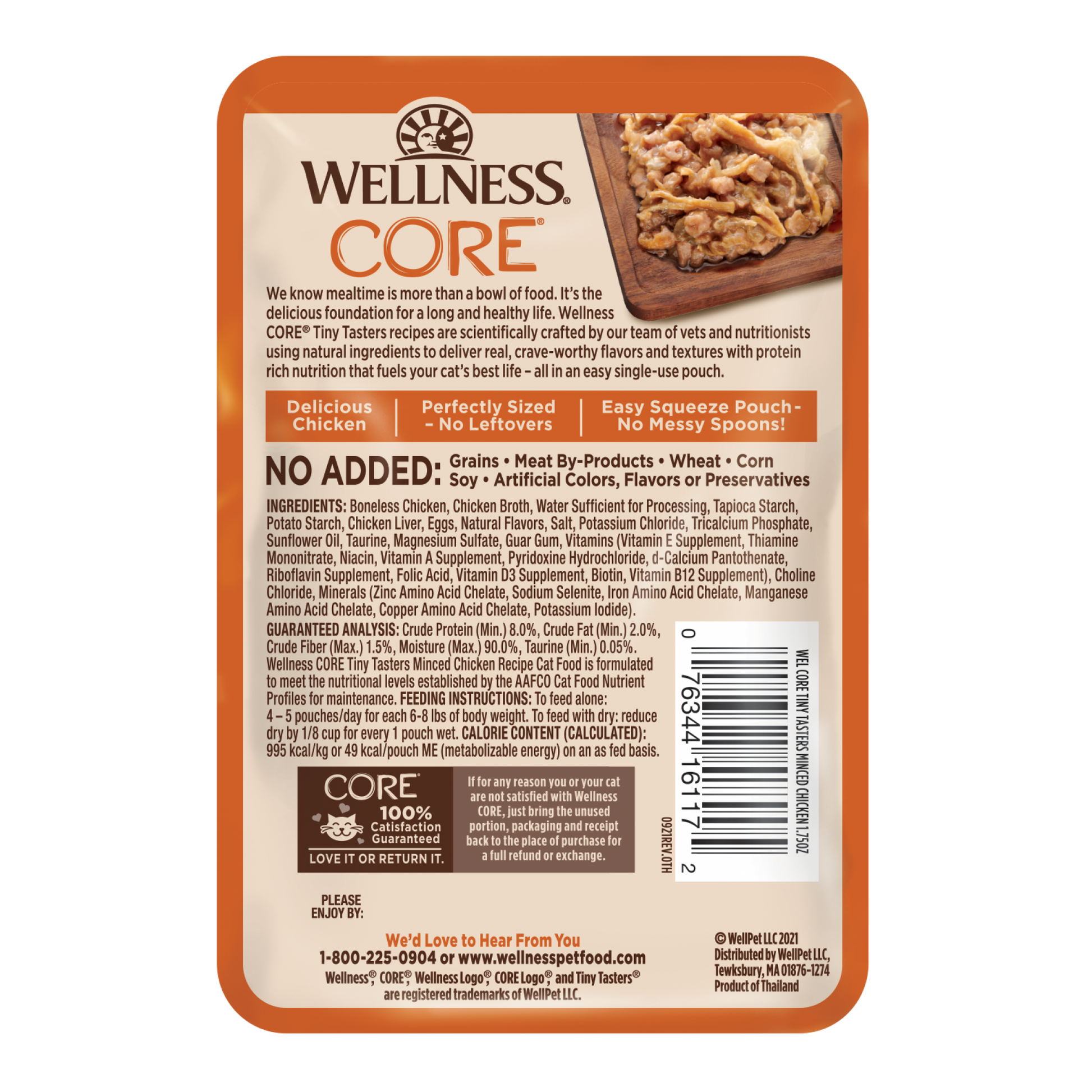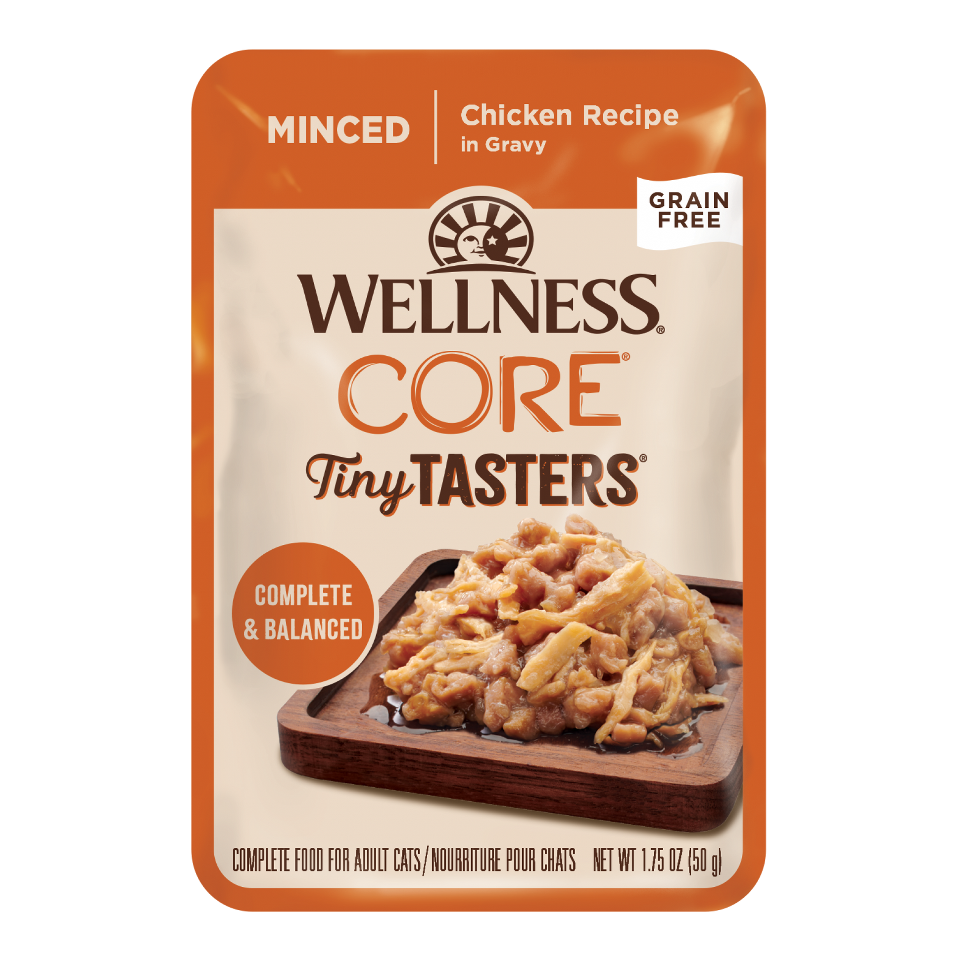 For a lifetime of wellbeing, each Wellness® CORE® Tiny Tasters® Minced recipe is crafted with delicious cuts of real meat that cats naturally love and need to live their best life. This grain free cat food delivers the natural nutrition your cat craves and is an excellent source of high quality proteins for a complete & balanced diet. These protein-packed recipes are available in a perfectly-sized pouch that is easy to use so there are no leftovers and no messy spoons.