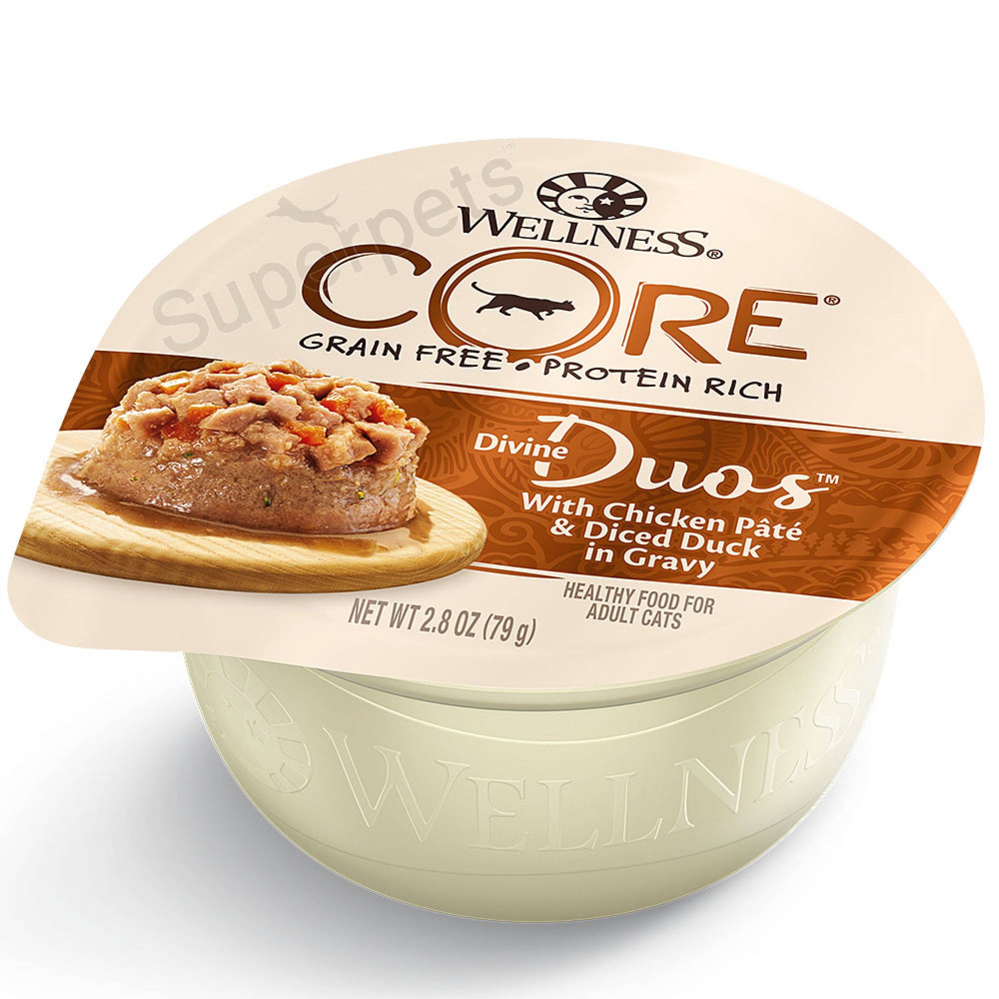 Wellness Core Divine Duos combines two tasty layers in one cup! With a layer of savory pate topped with a second layer of tender cuts in gravy, this grain-free protein-rich meal provides an elevated everyday meal experience. Ingredients: Chicken Broth, Water Sufficient for Processing, Chicken, Potato Starch, Duck, Carrots, Chicken Liver, Eggs, Natural Flavor, Broccoli, Salt, Potassium Chloride, Tricalcium Phosphate, Guar Gum, Taurine, Xanthan Gum, Locust Bean Gum, Sodium Carbonate, Magnesium Sulfate, Vitamins [Vitamin E Supplement, Thiamine Hydrochloride, Niacin, Vitamin A Supplement, Pyridoxine Hydrochloride, d-Calcium Pantothenate, Riboflavin Supplement, Folic Acid, Vitamin D3 Supplement, Biotin, Vitamin B12 Supplement], Choline Chloride, Minerals [Zinc Amino Acid Chelate, Iron Amino Acid Chelate, Manganese Amino Acid Chelate, Copper Amino Acid Chelate], Potassium Iodide, Sodium Selenite.