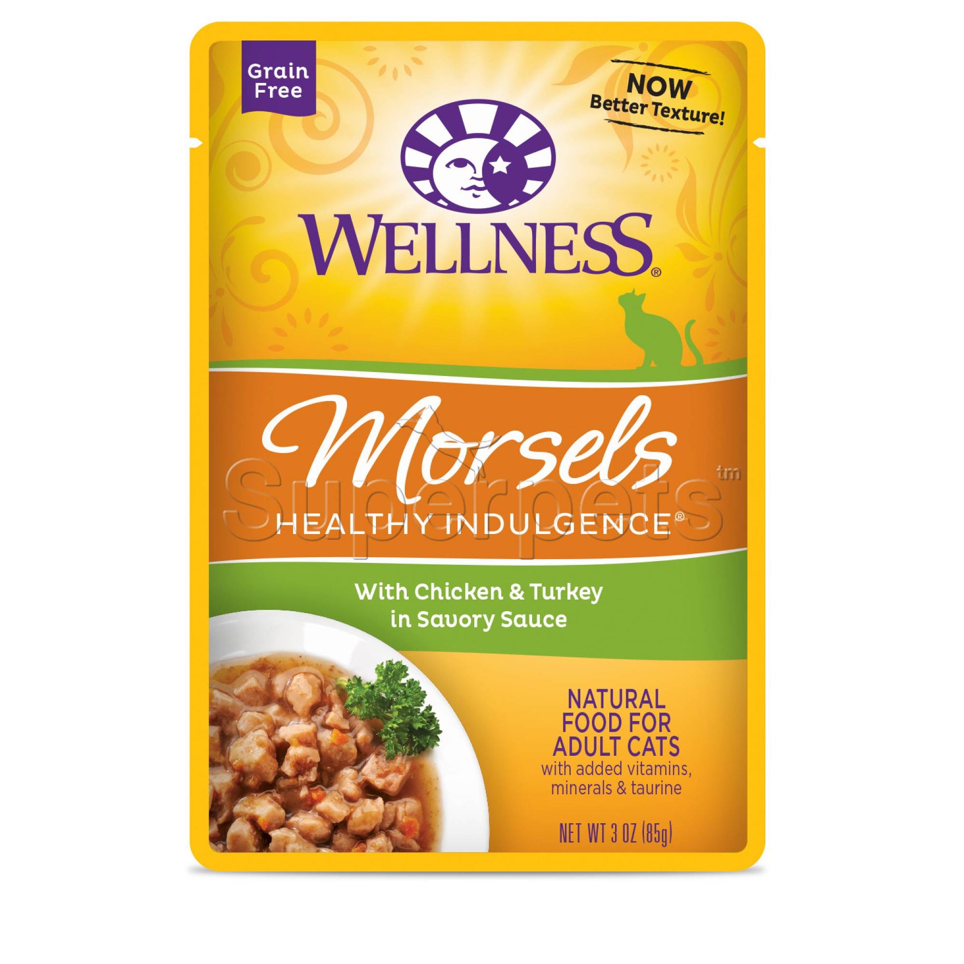 Wellness Healthy Indulgence Morsels Chicken & Turkey In Sauce Pouch Cat Food is a complete and balanced meal formulated for adult cats to provide energy for work and play while supporting your cat’s urinary system.